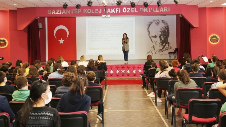 <p style="font-weight: 400; text-align: justify;">Sağlıklı beslenmenin önemine değinen Canbolat öğrencilerin konuyla ilgili sorularını da yanıtladı. Sağlıklı yaşamın ön koşullarından birisi olan sağlıklı beslenme konusunu masaya yatıran GKV Özel Okulları öğrencileri düzenlenen seminerde konunun uzmanı Beslenme ve Diyet Uzmanı Işıl Canbolat’ı ağırladılar. Gaziantep Kolej Vakfı Özel Ortaokulu 5.6 ve 7. sınıf öğrencilerine yönelik olarak gerçekleştirilen ve GKV Özel Okulları PDR Birimi tarafından düzenlenen “Sağlıklı Beslenme ve Duygusal Yeme” seminerinde, Beslenme ve Diyet Uzmanı Işıl Canbolat, ergenlik dönemi gelişim özelliklerine ve duygusal yeme konularında öğrencilere çeşitli bilgiler verdi. Sağlıklı beslenmenin dikkat ve motivasyon üzerindeki etkileri, diyet süreçleri, yanlış beslenme alışkanlıklarını değiştirmenin yolları hakkında çeşitli açıklamalar da yapan Canbolat etkinliğin sonunda öğrencilerin konuyla ilgili sorularını da yanıtlayarak öğrencilerle karşılıklı bilgi alış-verişi yaptı. Konuyla ilgili bir değerlendirme yapan GKV Özel Ortaokulu Müdürü Seçil Güldemet “İnsan yaşamı için sağlıklı beslenme en önemli faktörlerin başında gelmektedir. Bugün öğrencilerimizle Beslenme ve Diyet Uzmanı Işıl Canbolat’ı buluşturarak gerçekleştirilen seminerde özellikle ergenlik çağındaki bireylerin sağlıklı beslenme kurallarına nasıl uyacağı, sağlıklı beslenmenin kuralları ve ilgili daha birçok konuda söyleşi gerçekleştirdik. Önümüzdeki süreçte de bir birinden farklı konularda öğrencilerimizi bilgilendirmek ve eğitimlerine katkı sağlamak için konuların uzmanlarını ağırlamaya devam edeceğiz” dedi. </p>