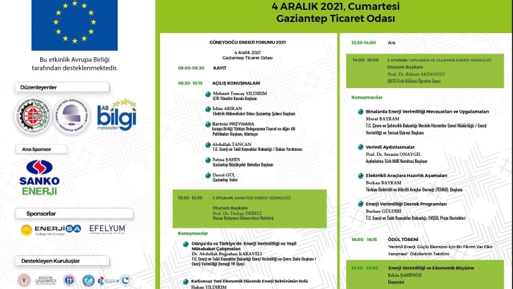 <p style="font-weight: 400; text-align: justify;">Gaziantep Valisi Davut Gül ve Gaziantep Büyükşehir Belediye Başkanı Fatma Şahin’in de konuşacağı forumda konusunda uzman birbirinden değerli isimler ile “Verimli Enerji, Güçlü Ekonomi” temasıyla, sanayide, yapılarda ve ulaşımda enerji verimliliği tüm boyutlarıyla değerlendirilecek.</p>