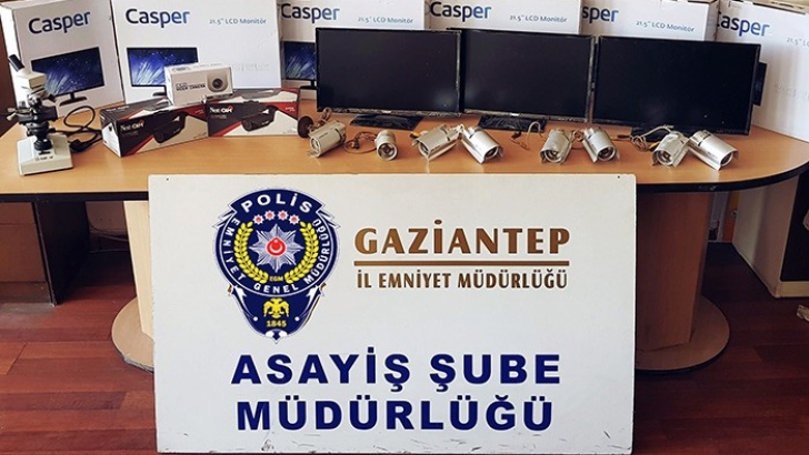 <p> Gaziantep'te bulunan bir ilköğretim okuluna giren hırsızlar önce güvenlik kamerasına, daha sonra polise yakalandı. <br />Olay, Şahinbey ilçesi Cumhuriyet Mahallesi'nde bir ilköğretim okulunda gerçekleşti. İki şüpheli hırsızlık için okula geldi. Pencereden tırmanan bir hırsız okulda bulunan monitörü çalarak aşağıda bekleyen ve etrafı gözetleyen diğer arkadaşına atıp, olay yerinden uzaklaştı. Olayla ilgili Asayiş Şube Müdürlüğü Hırsızlık Büro Amirliği ekiplerince olay yeri güvenlik kameraları incelendi. Yapılan çalışmalar neticesinde, olayı birçok hırsızlık suçundan kaydı bulunan İ.S. ve M.S. isimli şahısların gerçekleştirdiği tespit edildi. Şüpheli şahıslar yapılan operasyonla yakalanarak gözaltına alındı. Okuldan çalınan 6 adet monitör, 10 adet kamera, 1 adet mikroskobu satın aldığı tespit edilen M.T. isimli şahıs ise çalınan malzemelerle birlikte yakalandı. <br />Gözaltına alınan 3 şahıs haklarında yapılan yasal işlemler sonrası adli makamlara sevk edildi. Ele geçirilen malzemeler ise okul yetkilisine teslim edildi. </p>