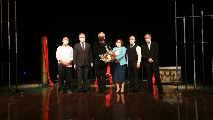 <p style="font-weight: 400; text-align: justify;">Oyunun sonunda sanatçıların performansı dakikalarca ayakta alkışlanırken Genel Sanat Yönetmeni Aydın Sigalı’ya teşekkür çiçeğini Büyükşehir Belediye Başkanı Fatma Şahin ve Vali Davut Gül verdi.</p>