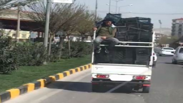 <p>Gaziantep’te boş kasalarla dolu kamyonetteki tehlikeli yolculuk görenleri şaşırttı. Kamyonetin arkasında hiçbir güvenlik tedbiri almadan yolculuk yapan genç, görenleri hayrete düşürdü. Yaşananlar ise başka bir sürücü tarafından cep telefonuyla saniye saniye kaydedildi.</p>