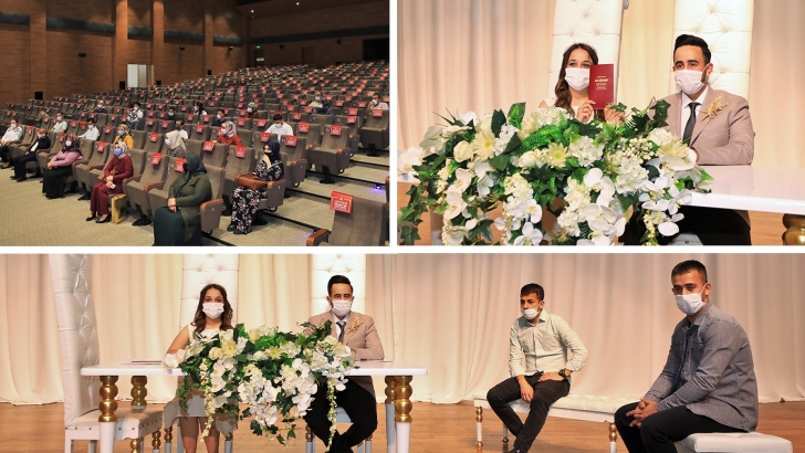 <p>İçişleri Bakanlığı tarafından yayımlanan genelge kapsamında Şehitkamil’de nikahlar yeniden kıyılmaya başlandı. Şehitkamil Nikah Salonu’nda (ŞNS) büyük hassasiyet gösterilerek kıyılan nikahlar; dezenfekte edilmiş ve havalandırması olan salonlarda, maksimum 20 kişinin katılımıyla yapılıyor. Sosyal mesafe, maske ve hijyen kurallarından taviz verilmeden gerçekleştirilen nikah törenlerinde aile cüzdanı, dezenfekte edilerek çiftlere teslim ediliyor.</p>