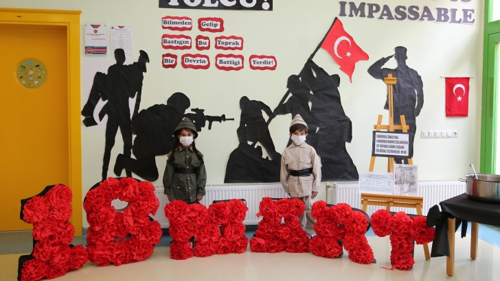 <p style="font-weight: 400; text-align: justify;">Çanakkale Oratoryosunu sahneleyen GKV Özel Anaokulu öğrencileri ayakta alkışlanırken kutlamalarda Covid-19 önlemlerin uygulandı.</p>