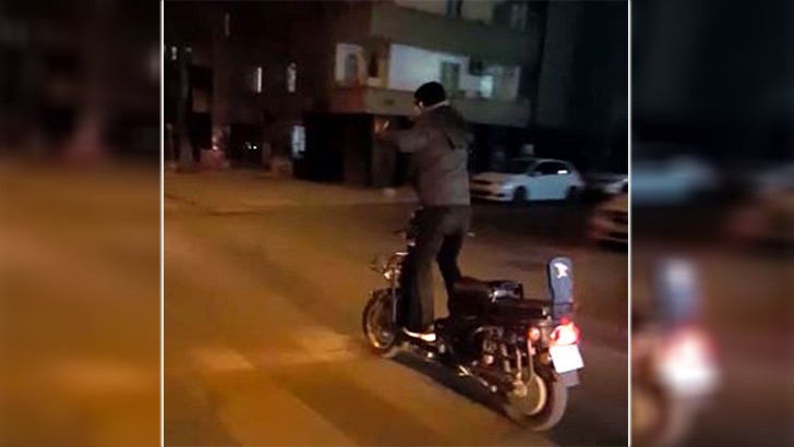 <p>Şehitkamil ilçesinde yaşanan olayda, seyir halindeki motosikletin üzerinde ayağa kalkan kimliği belirsiz genç, bir süre sonra direksiyonu da bıraktı. O anlar, yoldan geçen diğer sürücüler tarafından saniye saniye kaydedildi. Görüntülendiğini fark eden genç bir süre motosiklete oturarak hızla uzaklaştı.</p>