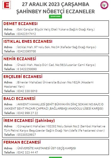 ŞAHİNBEY NÖBETÇİ ECZANELER