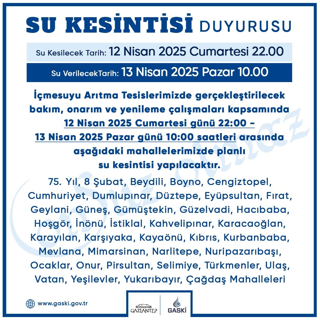 Gaziantep Su ve Kanalizasyon İdaresi (GAASKİ) ekipleri tarafından İçmesuyu Arıtma Tesisleri’nde yapılacak bakım, onarım ve yenileme çalışmaları kapsamında, 12 Nisan 2025 Cumartesi günü saat 22:00 ile 13 Nisan 2025 Pazar günü 10:00 saatleri arasında aşağıdaki belirtilen mahallelerde planlı su kesintisi yapılacak.