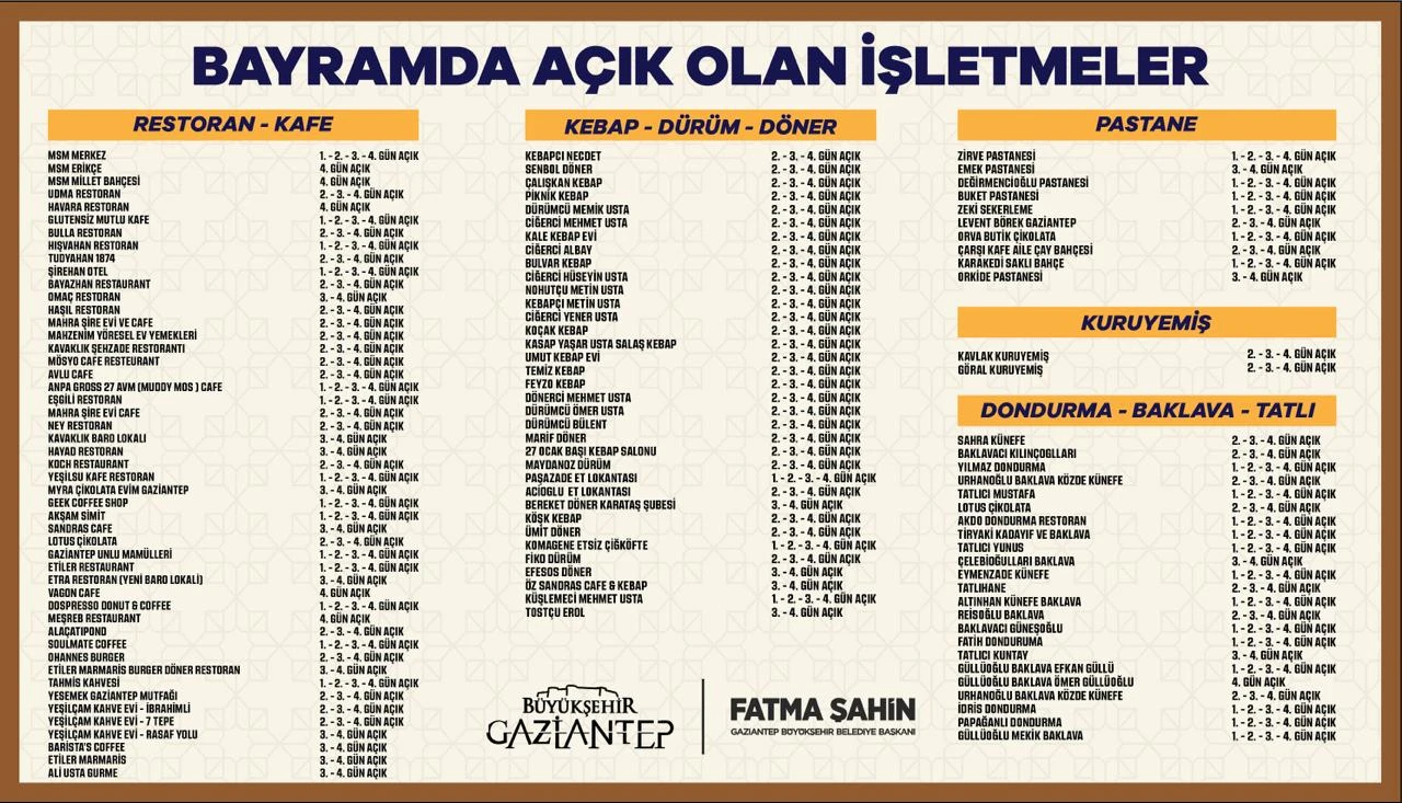 Gaziantep’te Kurban Bayramı’nda açık olan özel işletmeler belli oldu. Bayram süresince Gaziantep’i ziyaret edecek veya şehirde ikamet eden vatandaşlar, bu listeyi kullanarak işletmelere ulaşabilecek. Ayrıca ayrıntılı adres ve iletişim bilgileri için ilgili işletmelerle iletişime geçilebilecek.