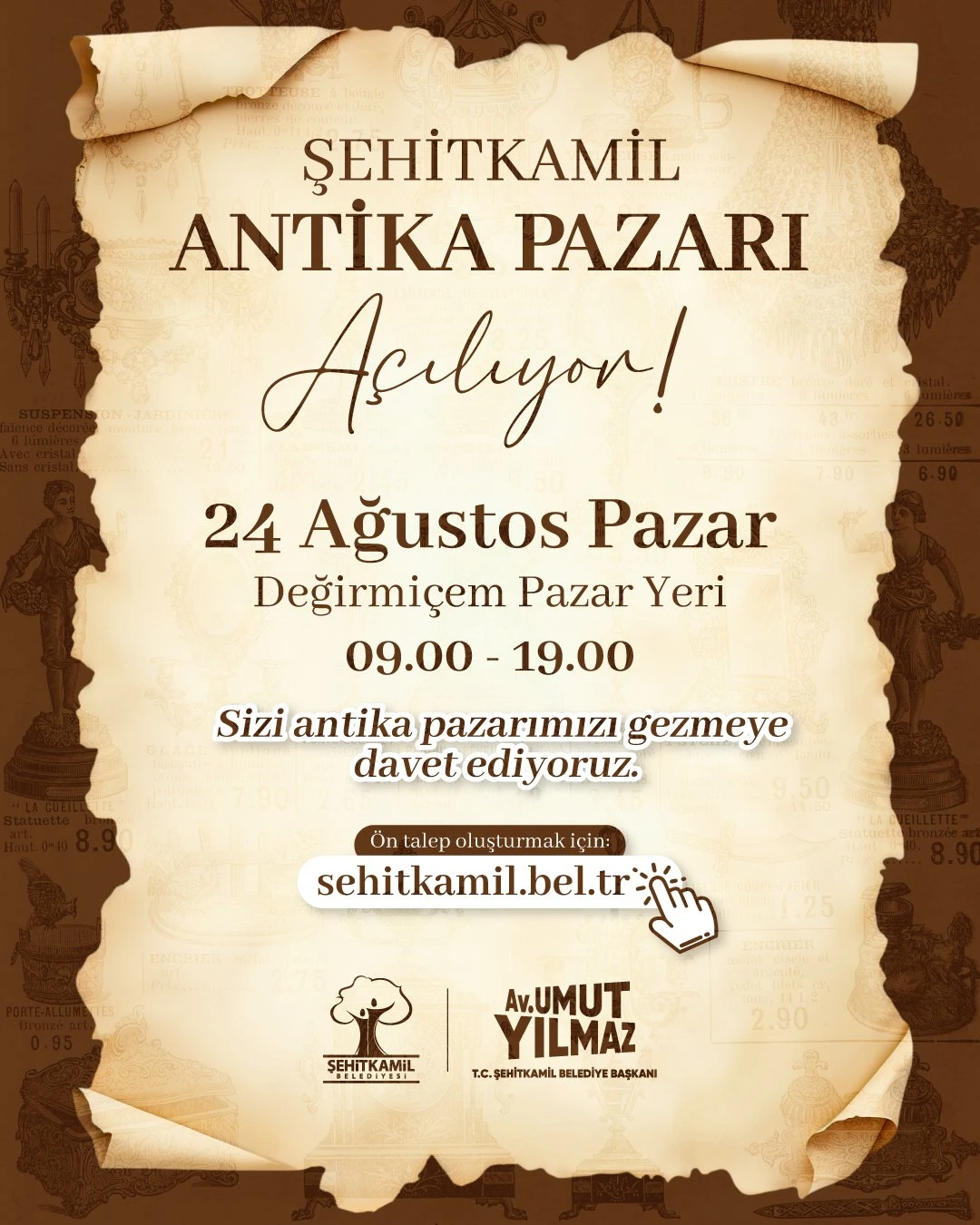 Şehitkamil Belediye Başkanı Umut Yılmaz, renkli anlara sahne olacak Antika Pazarı’na tüm Gaziantep halkını davet ederek, satış yapmak isteyen antika tutkunlarının sehitkamil.bel.tr adresi üzerinden başvuru yapabileceğini duyurdu.