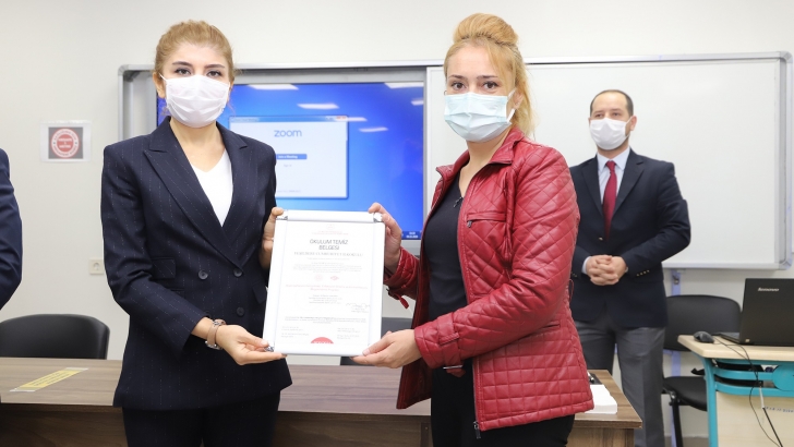 <p style="font-weight: 400;">Millî Eğitim Bakanlığı ile Sanayi ve Teknoloji Bakanlığı arasında imzalanan "Eğitim Kurumlarında Hijyen Şartlarının Geliştirmesi ve Enfeksiyonu Önleme" iş birliği protokolü kapsamında Oğuzeli’nde ‘Okulum Temiz Belgesi’ne başvuran ve belge almaya hak kazanan 35 okula belge takdim töreni düzenlendi.</p> <p style="font-weight: 400;">Milli Eğitim Bakanı Ziya Selçuk, Sanayi ve Ticaret Bakanı Mustafa Varank, Gaziantep Valisi Davut Gül, Gaziantep Büyükşehir Belediye Başkanı Fatma Şahin, Gaziantep Milletvekilleri Derya Bakbak ve Sermet Atay’ın video konferas yoluyla katılım sağladığı sertifika törenine Oğuzeli Kaymakamı Büşra Uçar, Oğuzeli Belediye Başkanı Mehmet Sait Kılıç, Oğuzeli İlçe Milli Eğitim Müdürü Necla İnal ile ‘Okulum Temiz Belgesini’ almaya hak kazanan okul müdürleri Oğuzeli Yatılı Bölge Ortaokulu konferans salonundan katılım sağladı.</p> <p style="font-weight: 400;">Okulum Temiz Belgesini’ almaya hak kazanan okul müdürleri belgelerini Oğuzeli Kaymakamı Büşra Uçar, Oğuzeli Belediye Başkanı Mehmet Sait Kılıç, Oğuzeli İlçe Milli Eğitim Müdürü Necla İnal’ın ellerinden aldılar.</p>