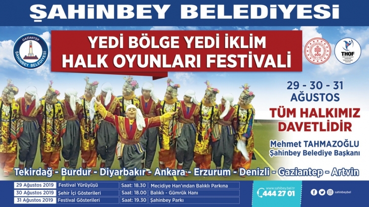 <p style="font-weight: 400;">Şahinbey Belediyesi sosyal belediyecilik hizmetine bir yenisini daha ekleyerek Yedi Bölgede Yedi İklim Halk Oyunları Festivali düzenliyor. Düzenlenecek olan festivale Tekirdağ, Burdur, Diyarbakır, Ankara, Erzurum, Denizli, Artvin ve Gaziantep’ten halk oyunları ekipleri katılırken, festival yarın (bugün) saat 18:30’da Mecidiye Han’ından, Balıklı Parkı’na yapılacak olan yürüyüşle başlayacak. Festival 30 Ağustos Cuma günü Balık ve Gümrük Han’ında yapılacak olan şehir içi gösterileriyle devam ederken, 31 Ağustos Cumartesi günü saat 19:30’da Şahinbey Parkı içerisinde yapılacak olan Festival gösterisiyle son bulacak.</p>