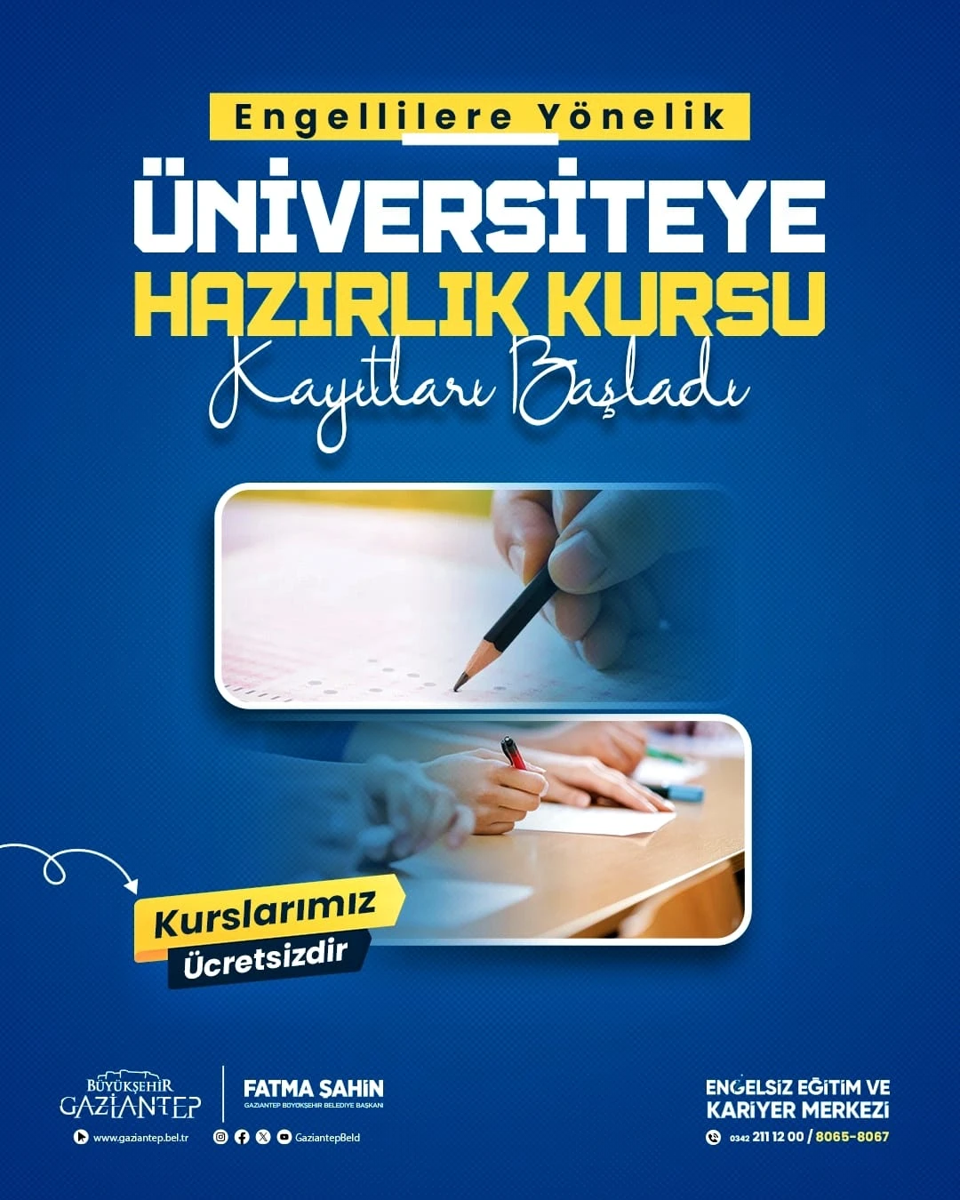Gaziantep Büyükşehir Belediyesi Engelsiz Eğitim ve Kariyer Merkezi’nde engellilere yönelik ücretsiz üniversite hazırlık kursu kayıtları başladı. Başvuru yapmak isteyenler, 0342 211 12 00 / 8065-8067 numaralı telefondan kayıt yaptırabiliyor.