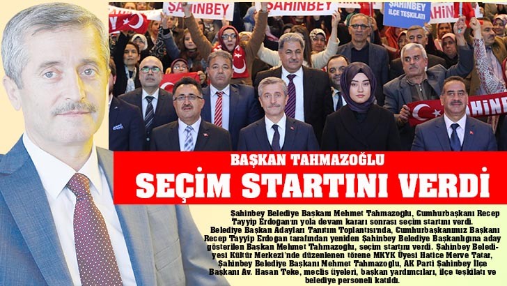 <p>Belediye Başkan Adayları Tanıtım Toplantısında, Cumhurbaşkanı Başkanı Recep Tayyip Erdoğan tarafından yeniden Şahinbey Belediye Başkanlığına aday gösterilen Mehmet Tahmazoğlu, seçim startını verdi. Şahinbey Belediyesi Kültür Merkezinde düzenlenen törene MKYK Üyesi Hatice Merve Tatar, Şahinbey Belediye Başkanı Mehmet Tahmazoğlu, AK Parti Şahinbey İlçe Başkanı Av. Hasan Teke, meclis üyeleri, başkan yardımcıları, ilçe teşkilatı ve belediye personeli katıldı. </p>