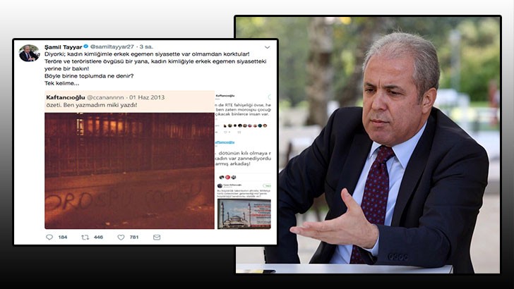 <p> Canan Kaftancıoğlu’nun 22 Haziran 2012, 1 Haziran 2013 ve 23 Aralık 2013 tarihlerinde Cumhurbaşkanı Recep Tayyip Erdoğan’a yönelik hakaret ve nefret içerikli söylemleri sosyal medya aracılığıyla yaptığı paylaşımlara Şamil Tayyar, tepki gösterdi. Kaftancıoğlu’nun kişi haklarını zedeleyecek nefret söylemi tweet’lerine karşı Şamil Tayyar, resmi twitter hesabından ‘’Diyor ki; kadın kimliğimle erkek egemen siyasette var olmamdan korktular! Teröre ve teröristlere övgüsü bir yana, kadın kimliğiyle erkek egemen siyasetteki yerine bir bakın! Böyle birine toplumda ne denir? Tek kelime...’’ şeklinde paylaşımda bulunarak Kaftancıoğlu’nu sert bir dille eleştirdi.</p>