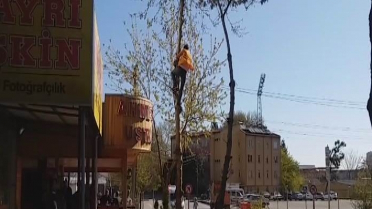 <p>Gaziantep’in Şehitkamil ilçesinde bir genç, bir iş yerinin önündeki yaklaşık 10 metre yüksekliğindeki ağaca, elinde testere ile birlikte tırmandı. Hiçbir güvenlik tedbiri almadan dalları budayan genç, zaman zaman vatandaşlara korkulu anlar yaşattı. Ölümle burun buruna olan genç, zaman zaman ağaca tutunmakta zorluk yaşadı. Tehlikeye rağmen rahat tavırları dikkat çeken genç, zaman zaman ağaçta cep telefonu ile de konuştu. Çevredekilerin meraklı ve korkulu bakışları arasında konuşmasını sürdüren genç, telefonu kapatıp cebine koyduktan sonra da işine devam etti. Genç, ağaçtan indikten sonra çevredeki vatandaşlar rahat nefes aldı.</p>