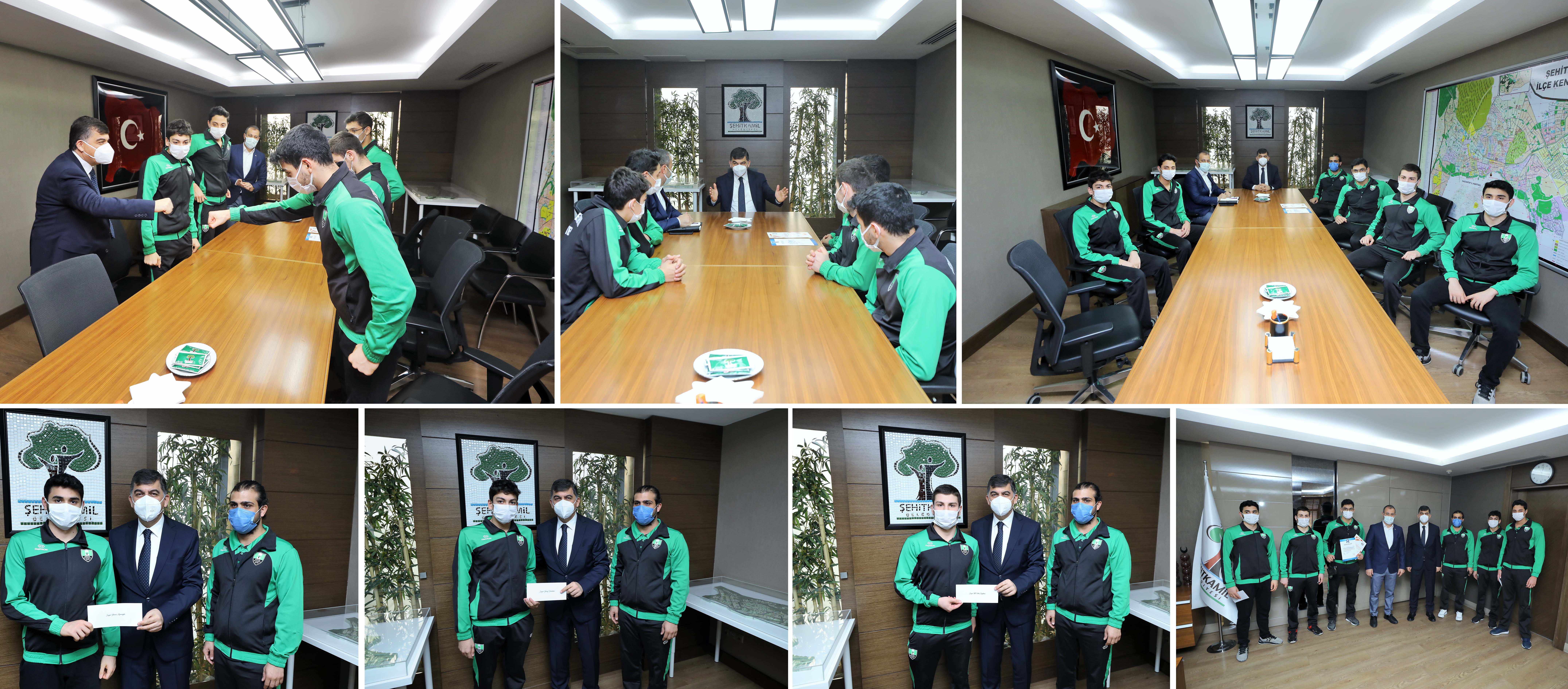 <p style="font-weight: 400; text-align: justify;">İstanbul’da düzenlenen Türkiye Arena Kulüplerarası Kısa Kulvar Genç ve Açık Yaş Yüzme Şampiyonası Yıldızlar Bireysel Yüzme Müsabakalarında 100 Metre Kurbağalama disiplininde ve Mersin’de düzenlenen Türkiye Yıldızlar Milli Takım Seçme İl Ön Elemesi ve Performans Müsabakaları 50 Metre Kurbağalama Uzun Kulvar yarışlarında Türkiye rekorunu kıran Kaan Kara ve aynı şampiyonalarda çeşitli müsabakalarda dereceye giren Yunus Ayvazoğlu, Barış Şahin, Talha Eryılmaz, Yusuf Balaban, Şehitkamil Belediye Başkanı Rıdvan Fadıloğlu’nu makamında ziyaret etti. Dereceye giren sporcuları makamında ağırlayan Başkan Rıdvan Fadıloğlu, elde ettikleri başarılarından ötürü yüzücüleri kutladı. Sohbet ortamında geçen ziyarette Başkan Fadıloğlu, yüzücülerden daha büyük başarılar hedeflemelerini istedi. Başkan Fadıloğlu, ziyaret sonunda yeni Türkiye rekortmeni Kaan Kara ve aynı şampiyonada ilgili müsabakalarda dereceye giren sporcuları ödüllendirdi.</p>
