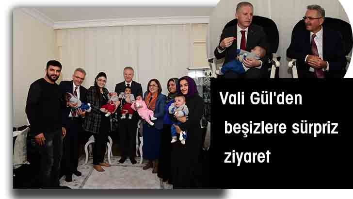 <p>Gaziantep Valisi Davut Gül, sosyal medya üzerinden mesaj atarak beşiz bebekleri ile kendisini ziyaret etmek istediklerini belirten aileye “Siz zahmet etmeyin biz geliriz” diyerek ziyarette bulundu. Aileye sürpriz yapan Vali Gül, beşiz bebekleri eşi Gülden Gül ve Büyükşehir Belediye Başkanı Fatma Şahin’le evlerinde ziyaret etti. </p> <p>Beşiz bebekleri ile yedi çocuk sahibi olan Esen ailesi, sosyal medya üzerinden bir mesaj paylaşarak Vali Davut Gül'ü ziyaret etmek istediklerini belirtmişti. Bu mesaj sonrası Vali Gül'ün sürpriz bir ziyarette bulunduğu aile, ziyareti memnuniyetle karşıladı. Baba İbrahim Esen, "Sosyal medya çağrımızı duyan Sayın Valimize çok teşekkür ediyoruz, biz ziyaret edelim dedik, kendileri zahmet edip geldiler. Çok mutlu olduk" dedi. Vali Gül, Esen ailesini tebrik ederek aile kurumunun önemine değindi. Gül, çocukların geleceğin mirasçıları olduğunu belirterek, “Çocuklarımız yarınlarımızın teminatı, yaşama sevincimizdir. Onların sağlıklı bir hayat sürmeleri için elimizden gelenin en iyisini yapmak bizlerin vazifesidir. Esen ailesinin bu güzel yavrularına sağlıklı, mutlu, hayırlı bir ömür diliyorum. Ailemize destek için zaten belediyelerimiz, sosyal yardımlaşma derneklerimiz bu konuda ellerinden geleni yapmışlar ve yapmaya da devam edeceklerdir. Bizler de üzerimize düşen görevleri yerine getirme gayreti içerisinde olacağız” şeklinde konuştu. <br />İsimleri Aslıhan, Ahmet, Berat, Mesut ve Selim olan bebeklerle yakından ilgilenerek bir süre onları seven Vali Gül, çeşitli hediyeler verdi. </p>