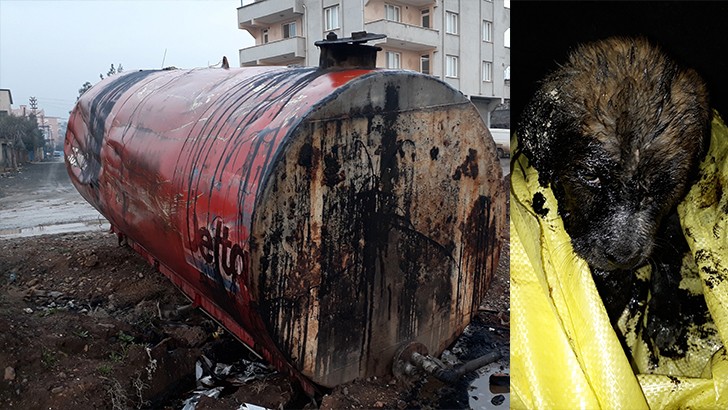 <p>Gaziantep'in İslahiye ilçesi Beyler Mahallesi Güllühöyük Caddesi üzerinde yeni doğan bir köpek yavrusu, cadde üzerinde oynayan Suriyeli çocuklar tarafından, bir hurdacıya ait bir ful-oil yakıt tankerine atıldı. Dolu olan tankerde boğulmak üzere olan köpek, olay yerine çağrılan itfaiye ekipleri tarafından kurtarıldı. Dışarı çıkarılan köpeğe, bölgede yaşayan hayvan sever Barış Akman tarafından sahip çıkıldı. Ful-oilin katılaşmaya başlaması nedeniyle yeniden zor anlar yaşayan yavru köpek, Akman ve hayvan severler tarafından zeytin yağı ile temizlendi. Yaklaşık 10 kiloluk zeytin yağı, bebe şampuanı ve su ile tamamen temizlenen köpek, yeniden yaşama döndürüldü.<br />Akman, temizlenen yavrunun karnını da doyurduktan </p>