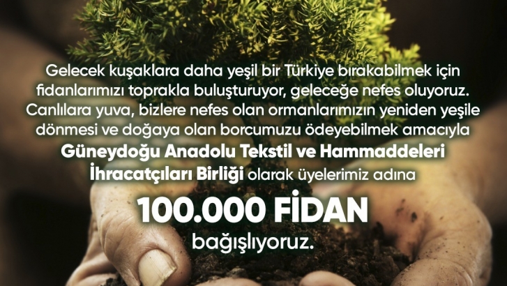 <p style="text-align: justify;">TİM tarafından başlatılan kampanyaya 100 bin fidan bağışladıklarını açıklayan Güneydoğu Anadolu Tekstil ve Hammaddeleri İhracatçıları Birliği Başkanı Ahmet Fikret Kileci son günlerde Türkiye genelinde yaşanan orman yangınlarını büyük bir üzüntü içerisinde izlediklerini ifade ederek “Hepimizin yüreği yanıyor, ülkemizin ciğerleri yanıyor. TİM tarafından başlatılan yeşil seferberliğe yüz bin fidan bağışıyla destek vermeye karar verdik. Ormansız bir yurt vatan değildir. Gelecek kuşaklara daha yeşil bir Türkiye bırakabilmek için fidanlarımızı toprakla buluşturuyor, geleceğe nefes olmak istiyoruz. Canlılara yuva, bizlere nefes olan ormanlarımızın yeniden yeşile dönmesi doğaya olan borcumuzu ödeyebilmek amacıyla TİM tarafından başlatılan kampanyaya Güneydoğu Anadolu Tekstil ve Hammaddeleri İhracatçıları Birliği üyelerimiz adına 100 bin fidan bağışlıyoruz. Fidanlarımızın toprakla buluşması için elimizden gelenleri yapacağız. Yurdun farklı noktalarında çıkan yangınlarda yaşamlarını yitiren vatandaşlarımıza Allahtan rahmet, aileleri ve yakınlarına başsağlığı dilerken ülkemizin bu felaketlerden bir an önce kurtulmasını temenni ediyoruz” dedi. </p>