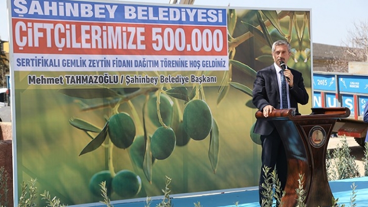 <p>Çiftçilere daha önce 2 bin ton Ceyhan 99 buğday tohumu, 2 bin ton gübre ve 3 bin 500 ton hayvan yemi dağıtan Şahinbey Belediye Başkanı Mehmet Tahmazoğlu, 500 bin adet zeytin fidanı desteğinde bulunarak üretimi teşvik etmek için proje başlatmıştı. Başkan Tahmazoğlu proje kapsamında Zeytinli Mahallesi’nde zeytin fidanı dağıtımı yaptı. Gerçekleştirilen dağıtım törenine AK Parti Gaziantep Milletvekili Nejat Koçer, Şahinbey Belediye Başkanı Mehmet Tahmazoğlu, Gıda Tarım ve Hayvancılık İl Müdürü Mehmet Karayılan, AK Parti Şahinbey İlçe Başkanı Av. Hasan Teke protokol üyeleri ve vatandaşlar katıldı. </p>